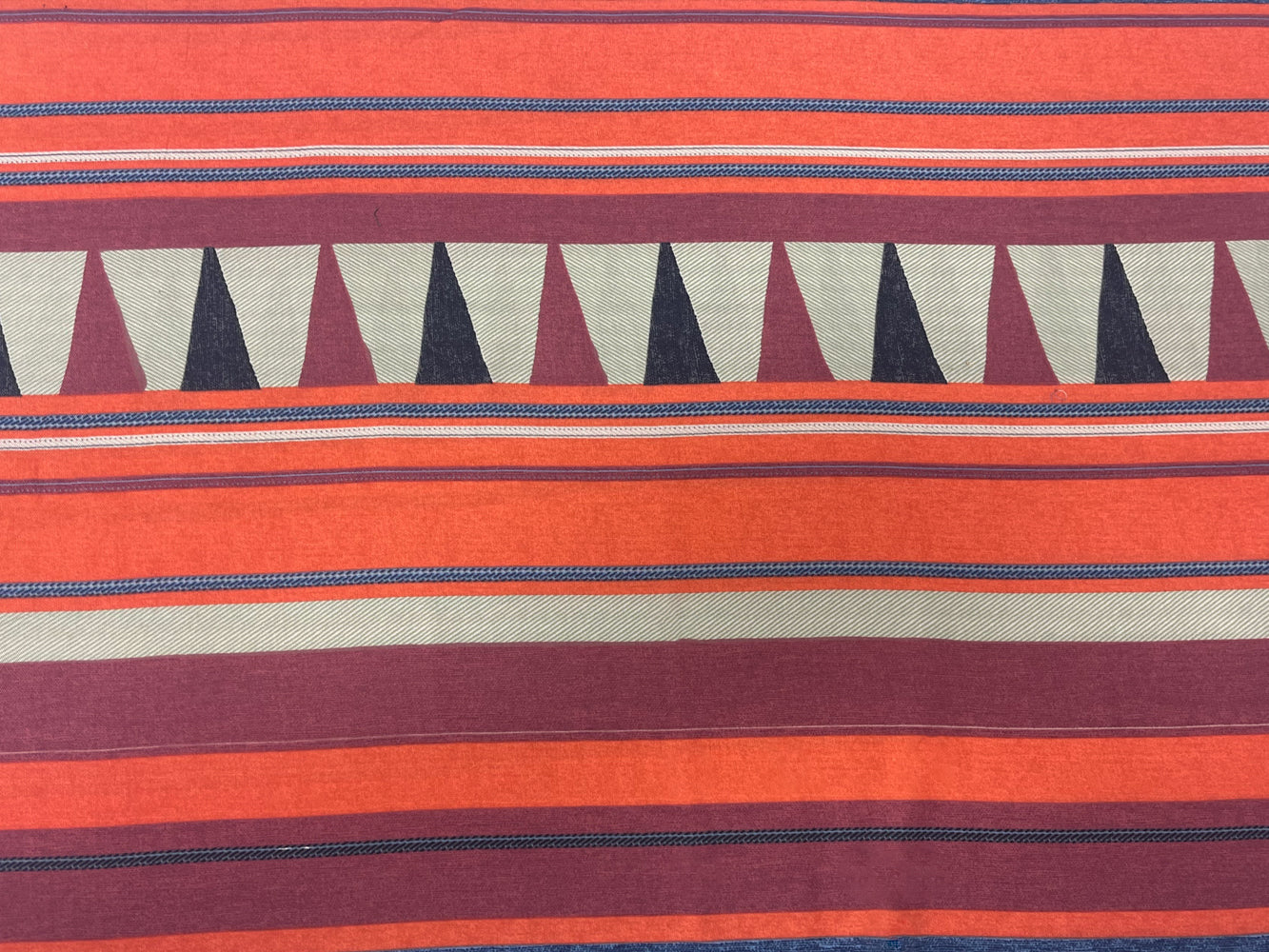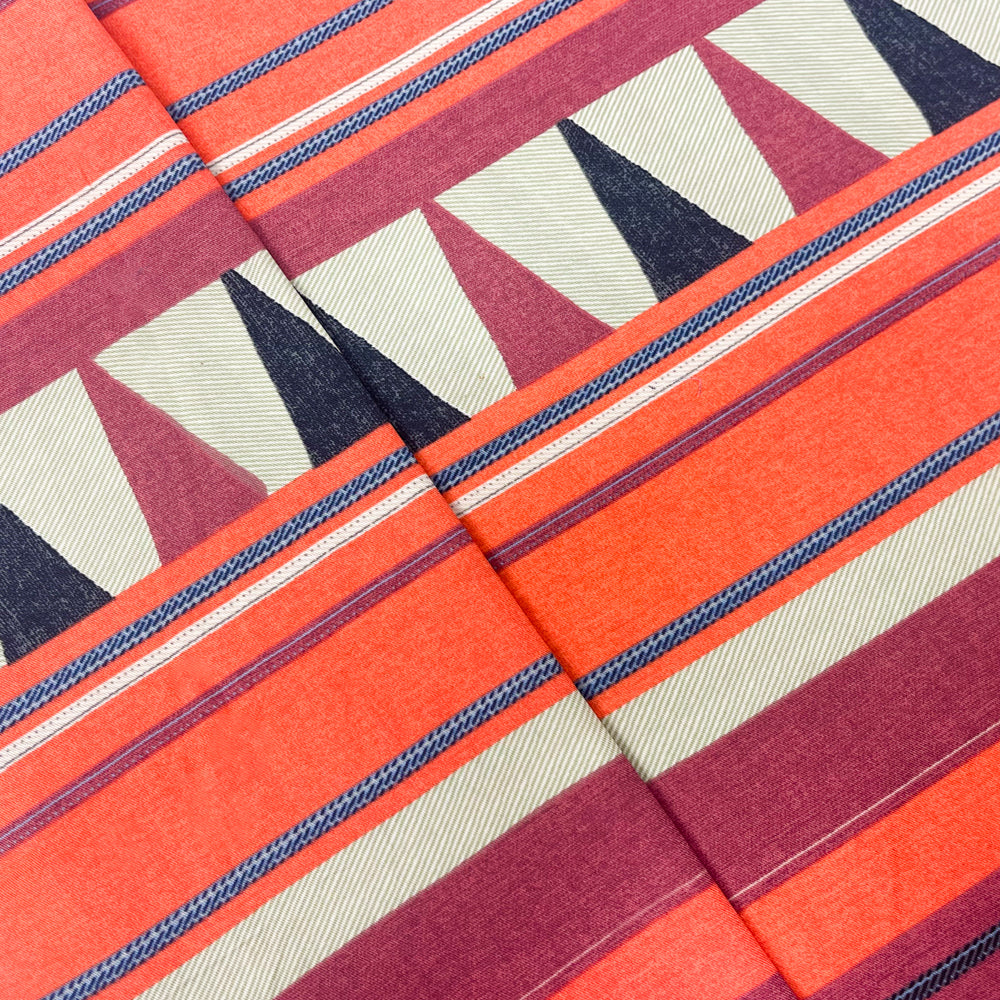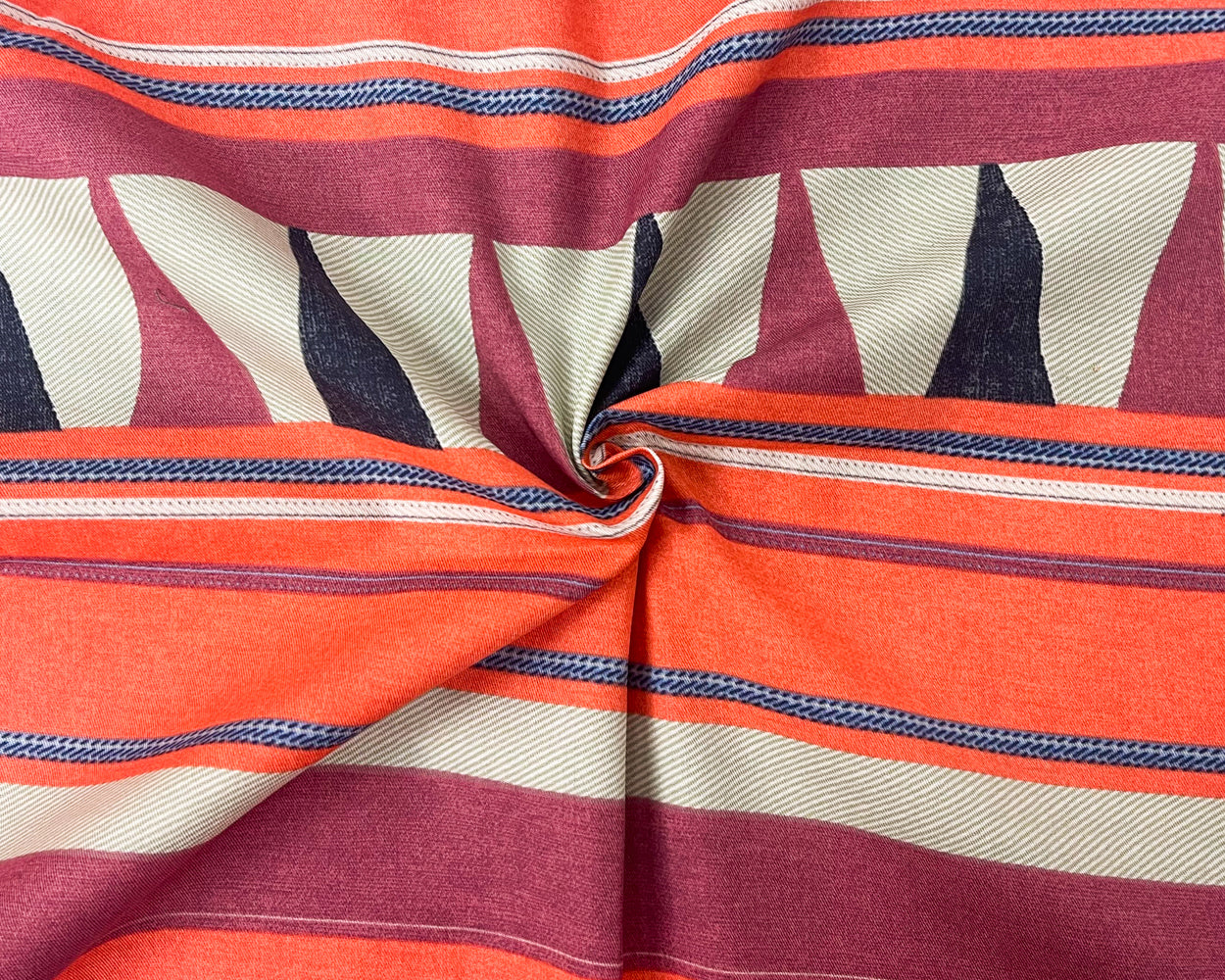 -100% cotton twill woven fabric printed with a tribal inspired pattern featuring horizontal stripes, textured-like surface, and triangles.