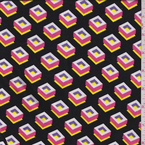 1 5/8 YD PC-Black/Hot Pink/Yellow Geo Cube Double Brushed Jersey Knit Fabric