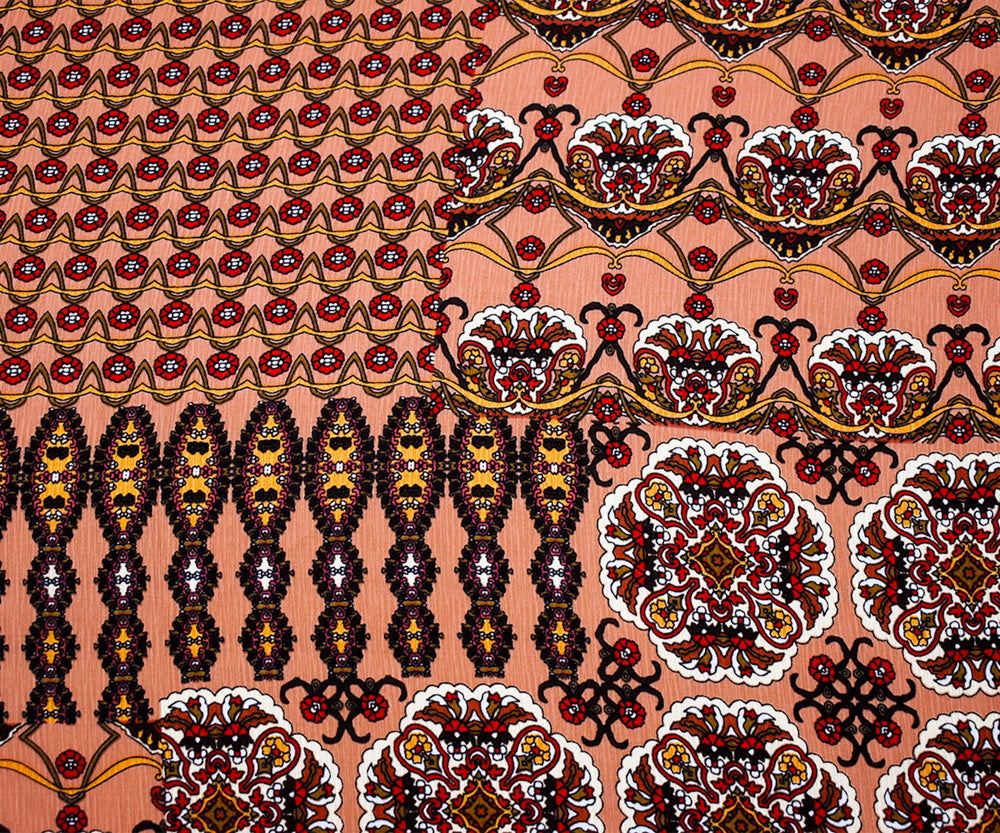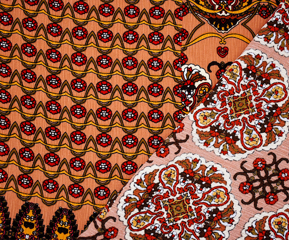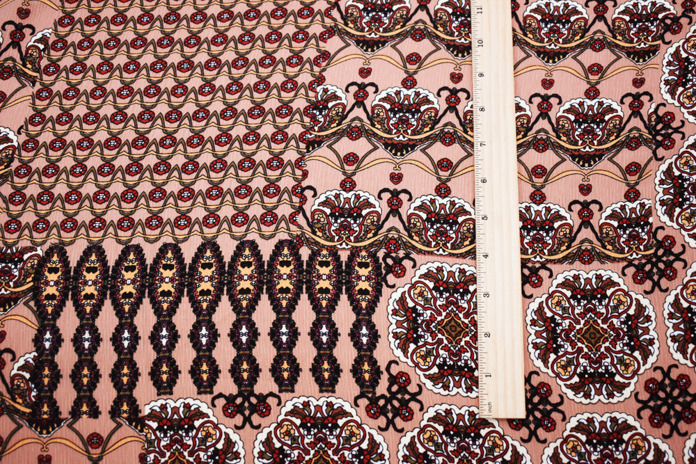 Tan Beige-Brown Multi Pattern Mandala Printed Crinkled Dobby Woven Fabric