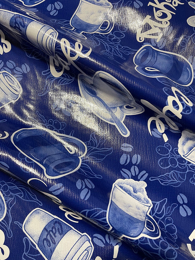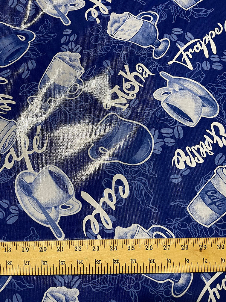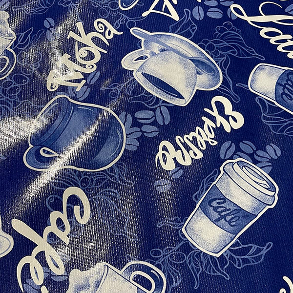 Blue and White Coffee Print Oilcloth Fabric