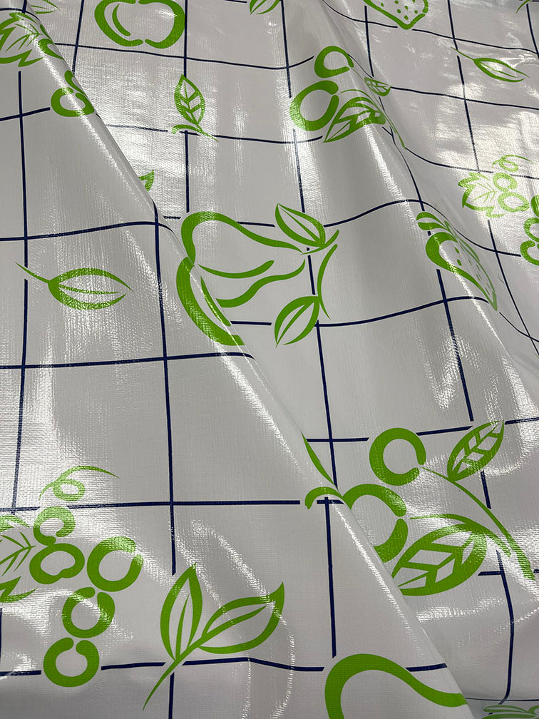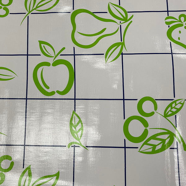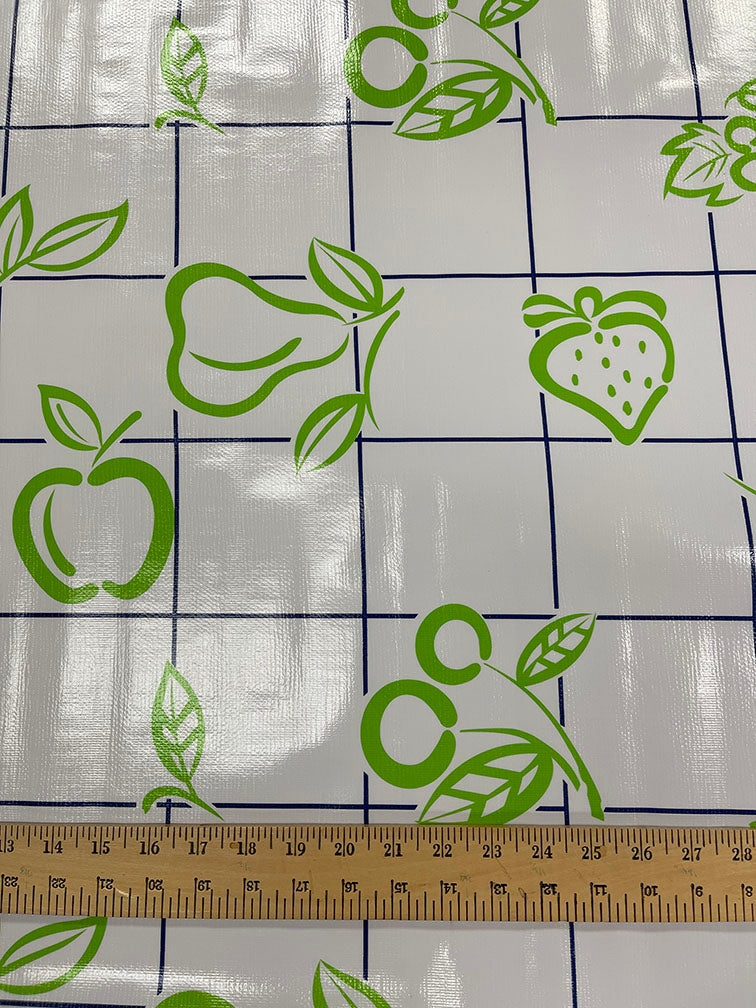 Lime Green Fruit Print with Navy Blue Check Print on White Oilcloth Fabric