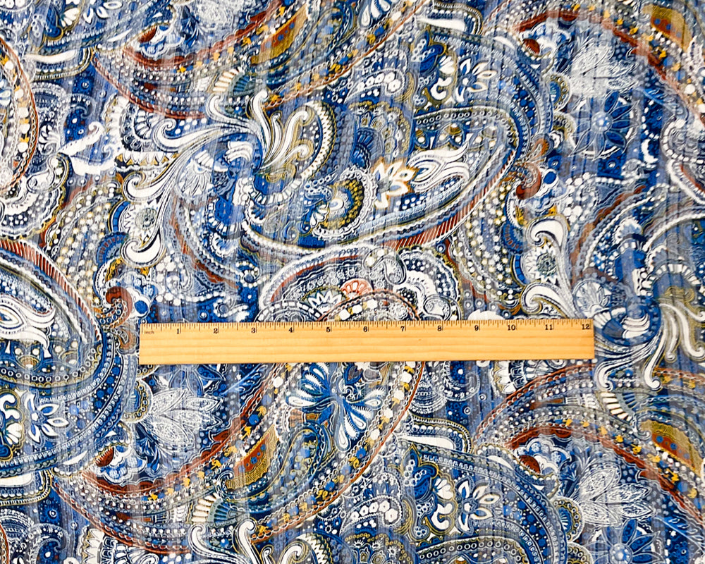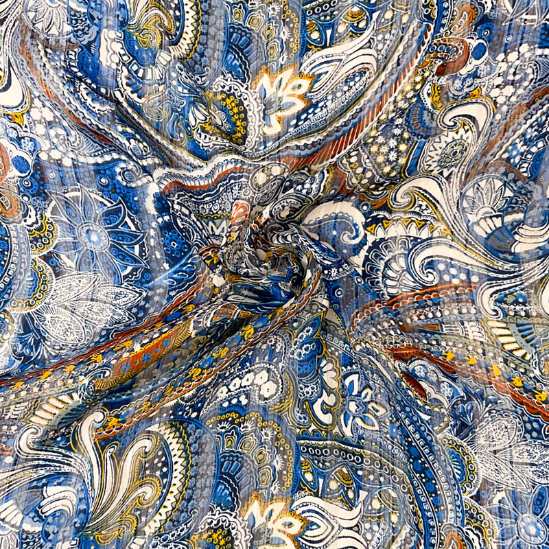 -Blue-Multi Poly Paisley Printed Satin Stripe Chiffon Woven Fabric