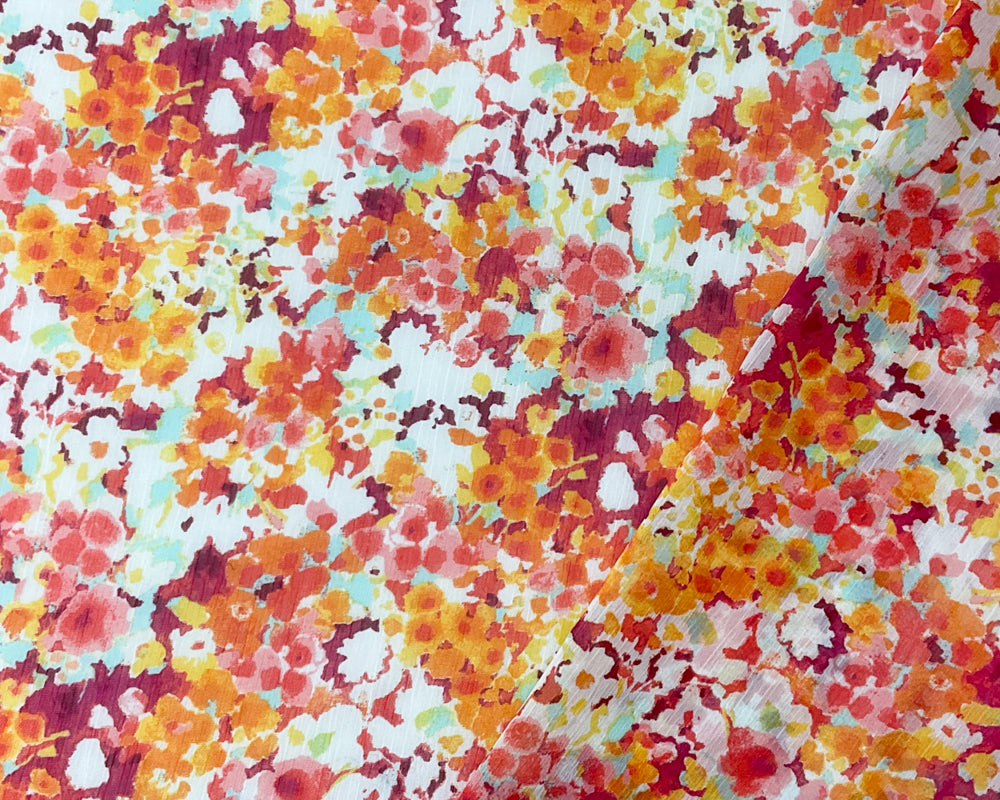 Red-Yellow Poly Floral Printed Crinkle Yoryu Chiffon Woven Fabric
