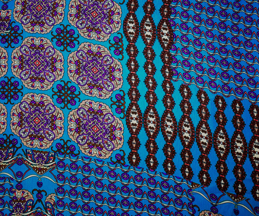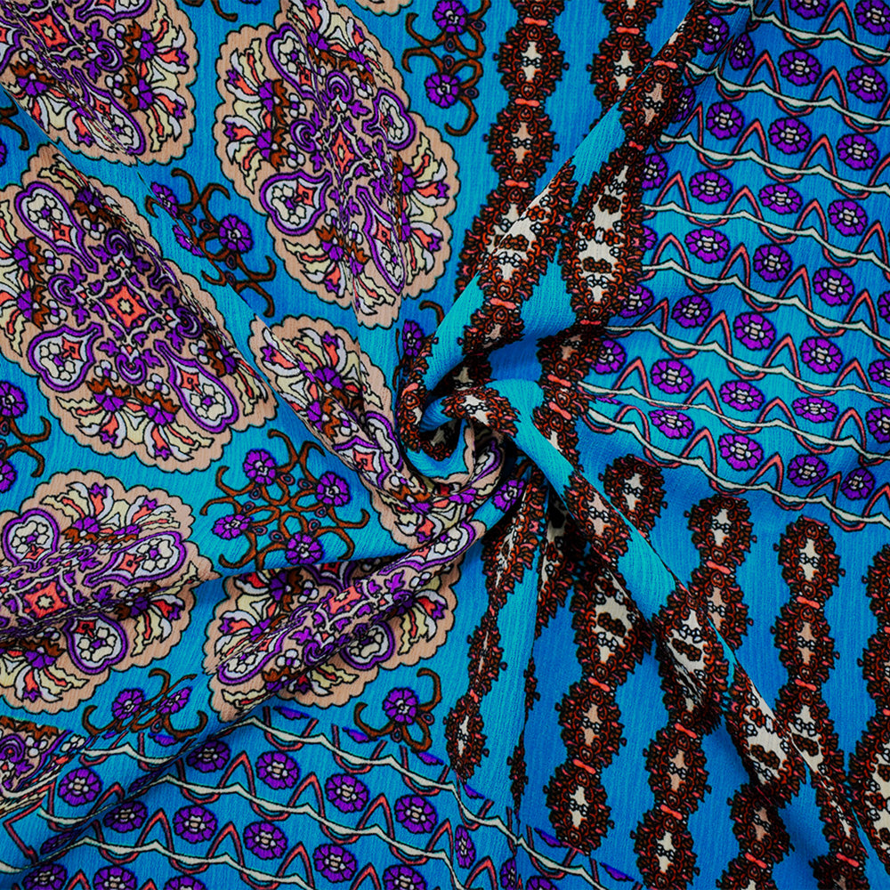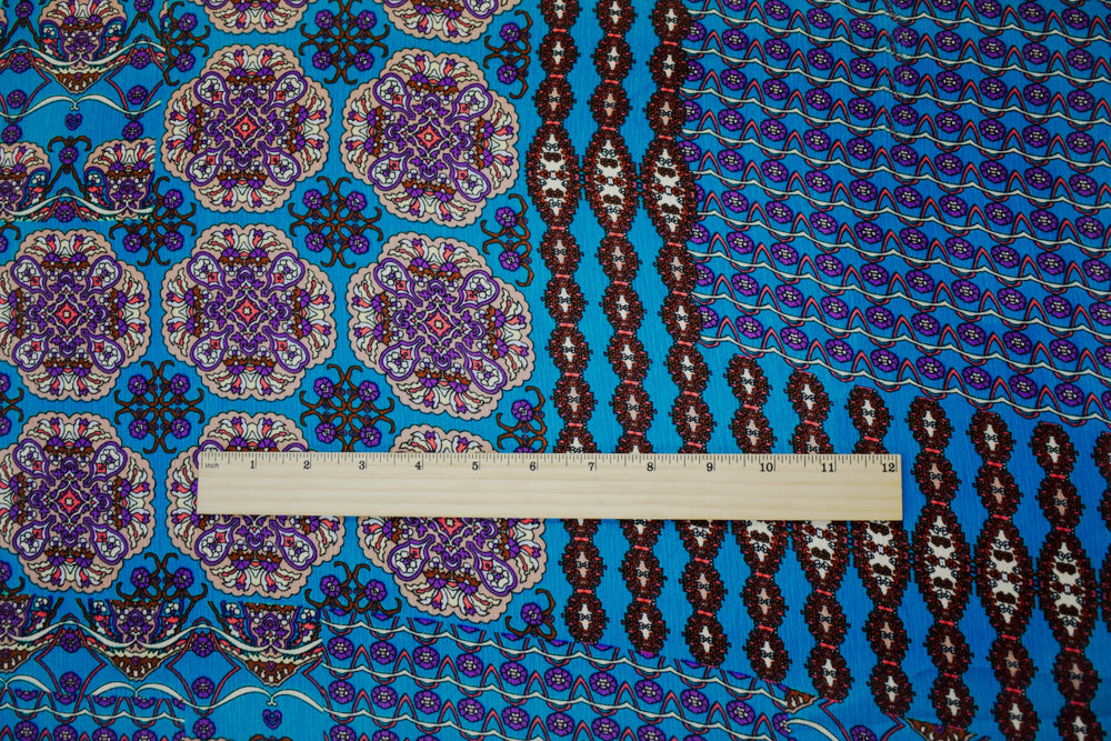 Turquoise-Brown-Multi Poly Mandala Printed Crinkled Dobby Woven Fabric
