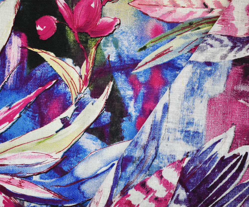 -100% linen plain woven fabric printed with stylized and artistic tropical inspired leaves with florals.