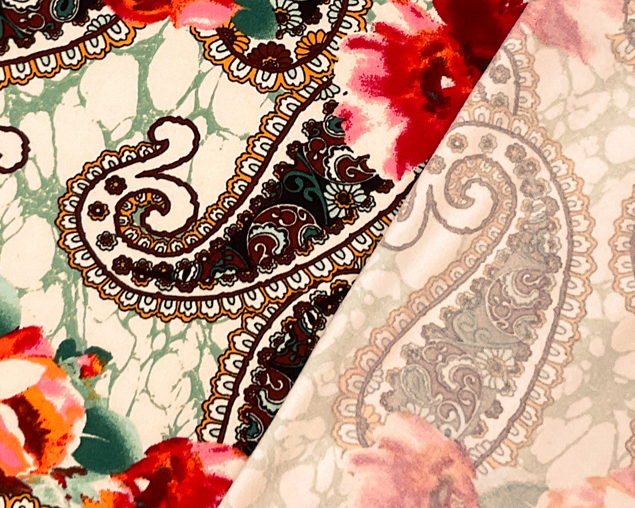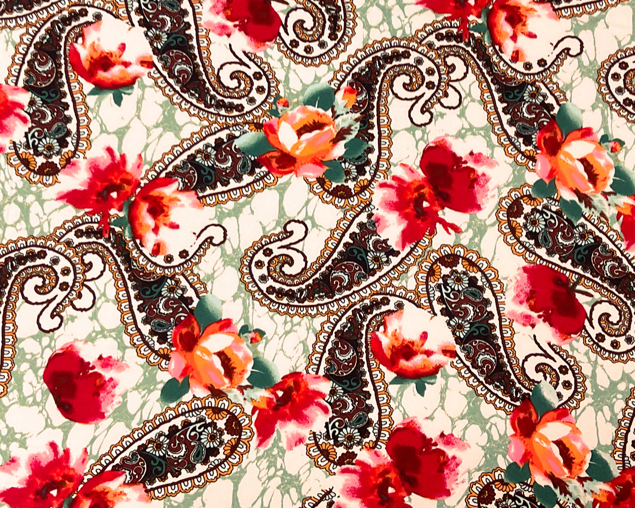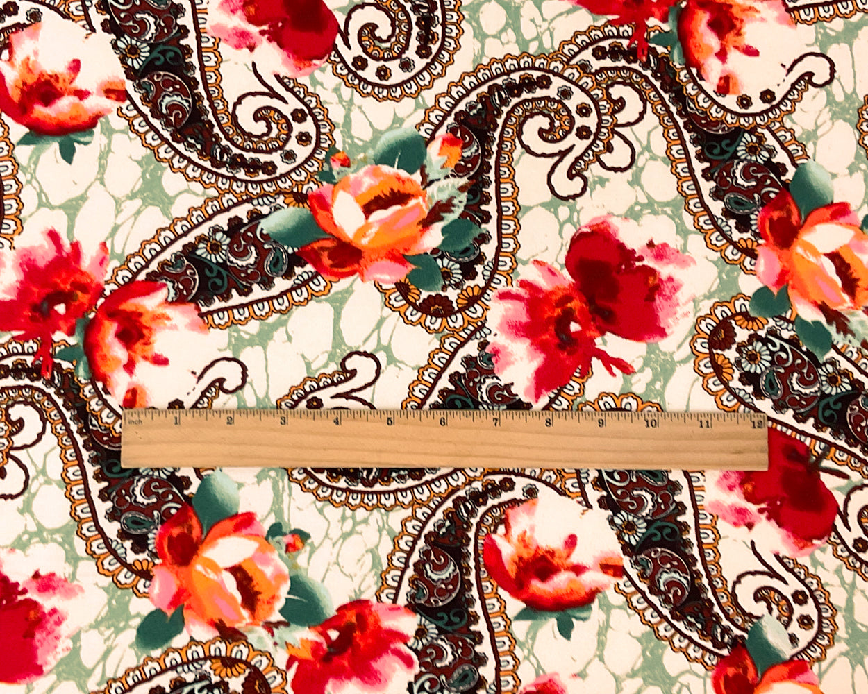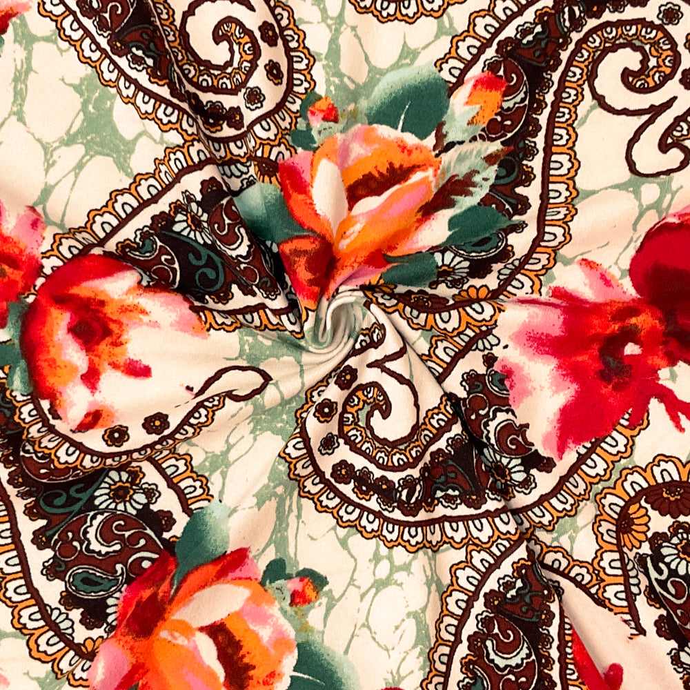 3 YD PC -Ivory-Multi Poly Spandex Stretch Paisley Floral Print Double Brush Jersey Knit Fabric