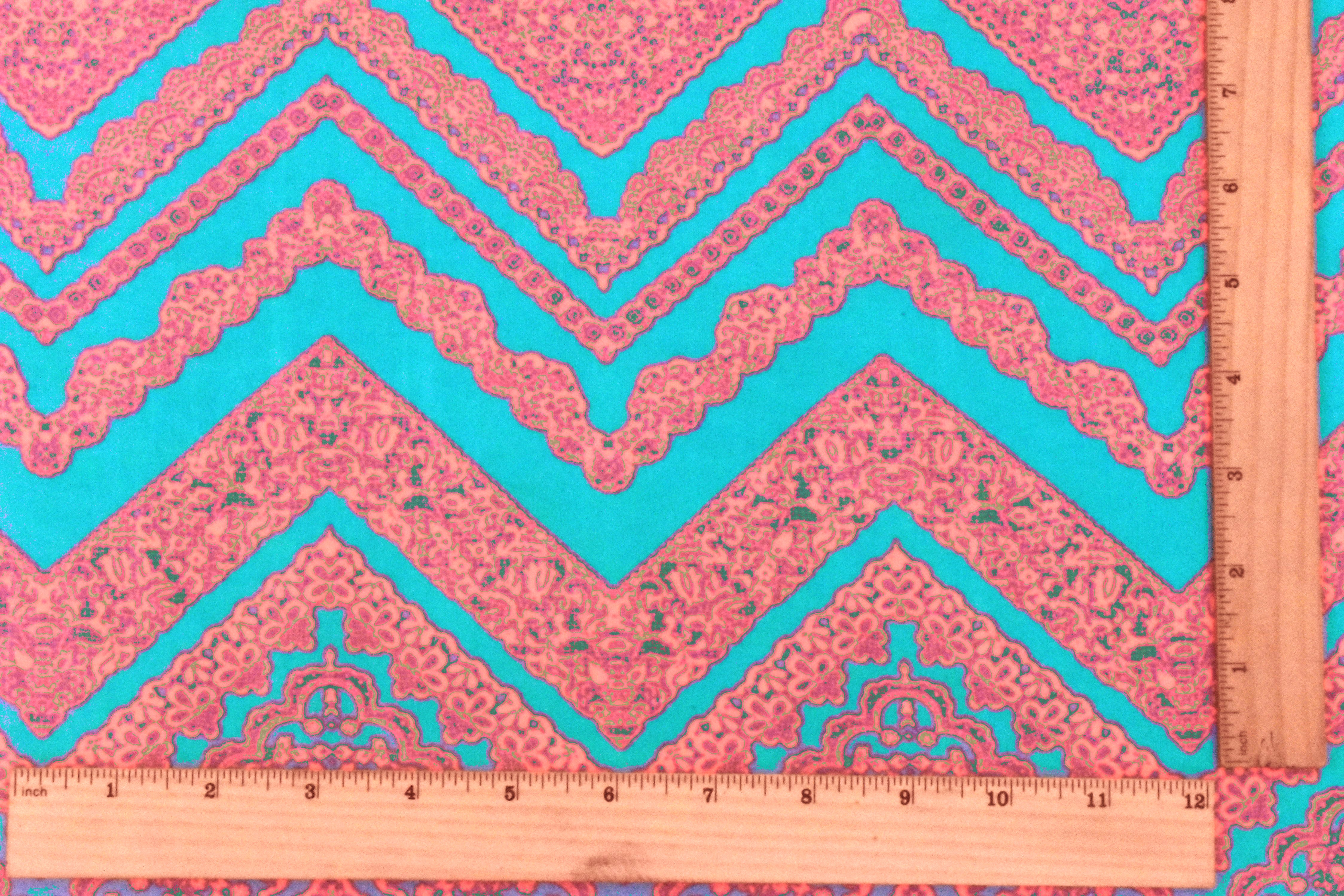 -Double brushed ITY jersey knit fabric printed with a bright colored lace-like chevron pattern