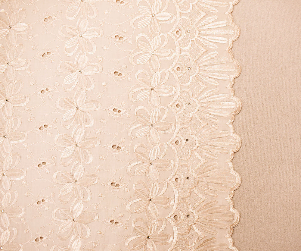 Beige Poly-Cotton Embroidered Floral Scallop Rhinestone Woven Fabric