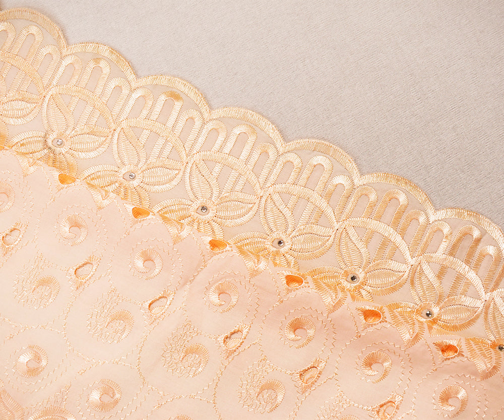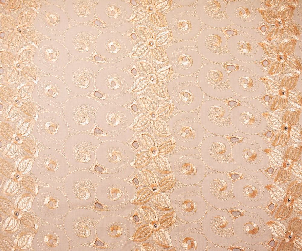 -Poly and cotton blend plain woven fabric embroidered with African inspired pattern in beautiful floral and swirl designs, scalloped edges, eyelets, and decorated with hints of rhinestones.