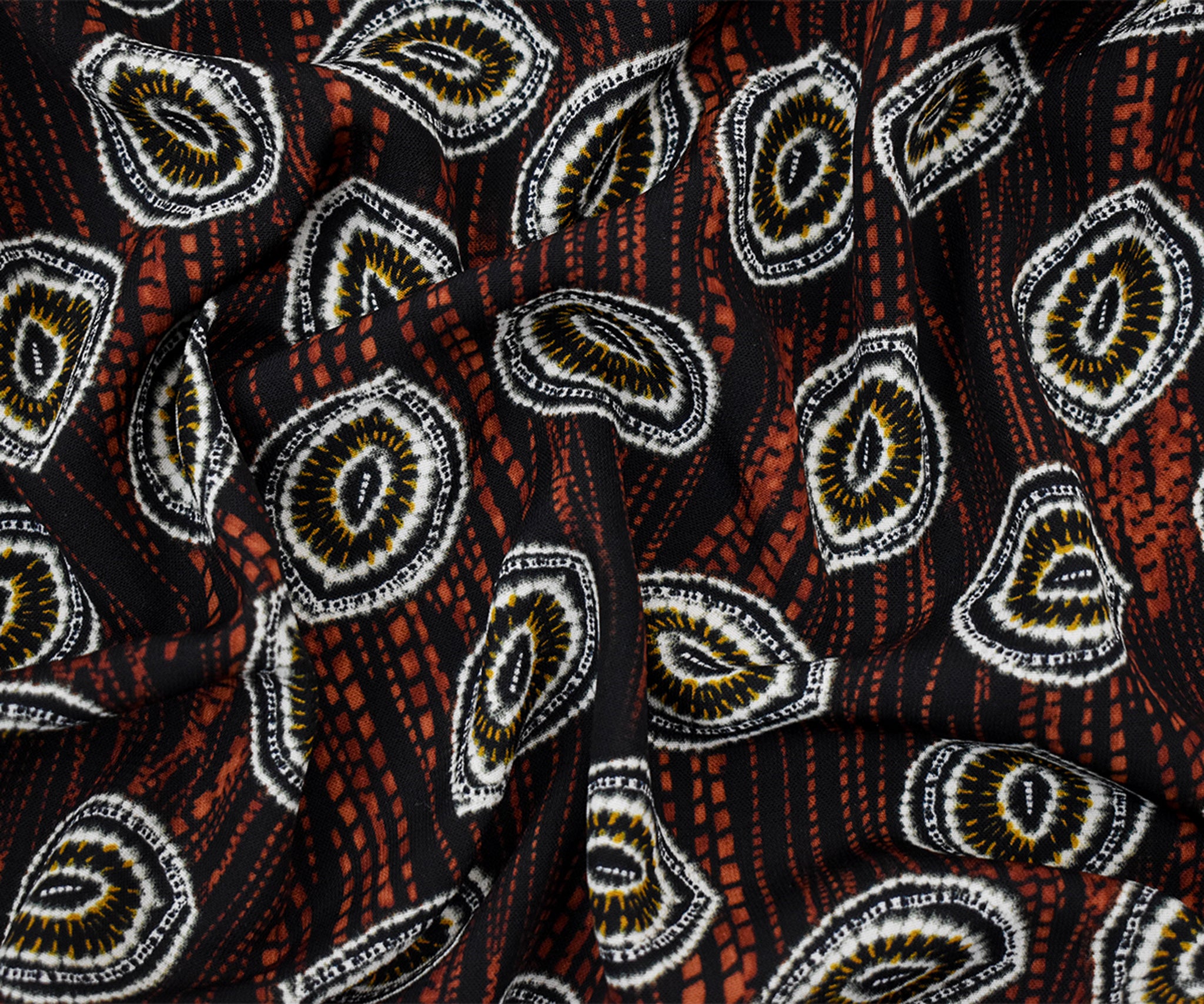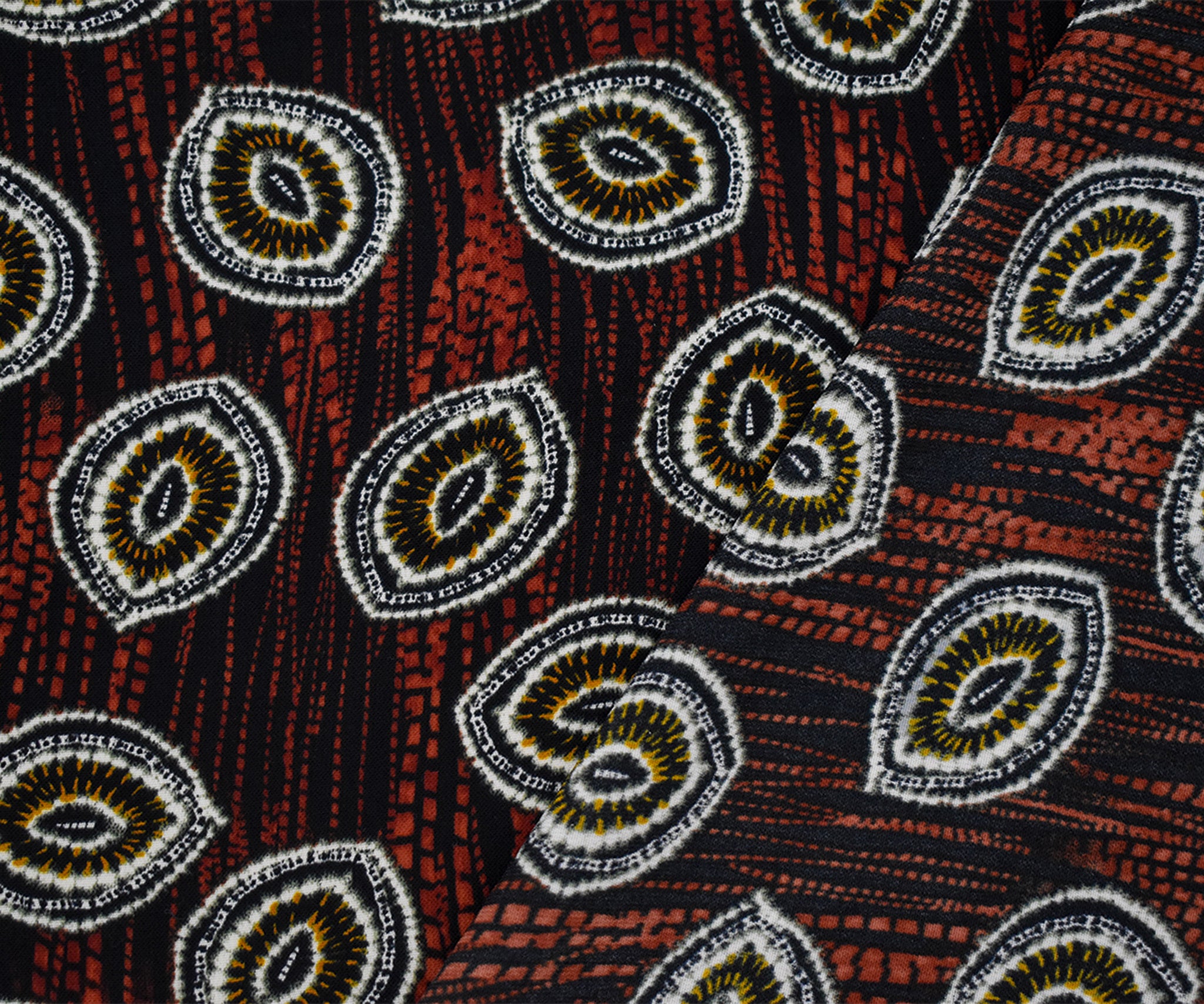 Black-Red-Multi Abstract Tie Dye Printed Poly Challis Woven Fabric