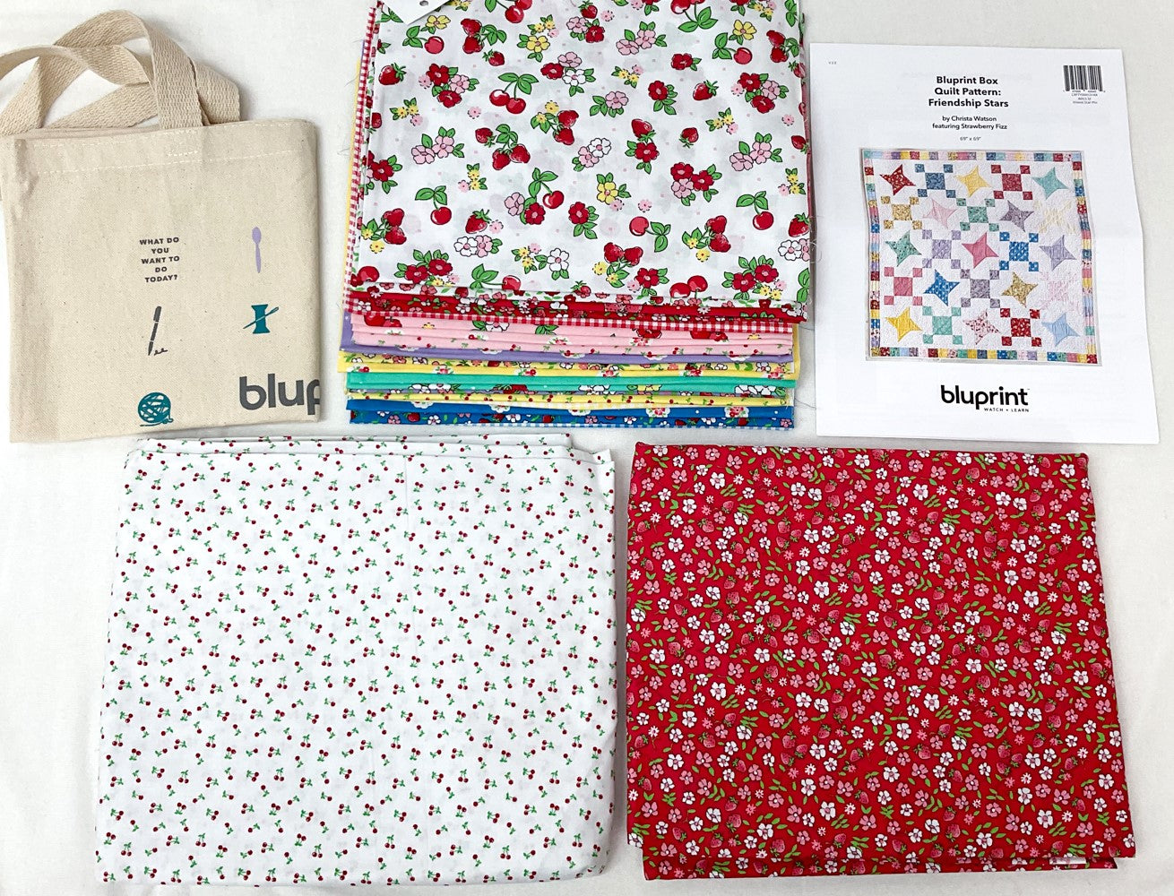 - Bundle fabrics include: 4 yards mini strawberry floral on red, 4 3/4 yards mini cherries on white, plus 18 fat quarters, 1 fat quarter each, of large floral on white, strawberry mini floral on white, large strawberry floral on red, strawberry mini floral on red, red white printed gingham, large strawberry floral on pink, floral dot on pink, mini cherries on pink, floral dot on lilac, strawberry mini floral on lilac, large strawberry floral dot on green, floral dot on yellow , mini strawberry on yellow, mini cherries on yellow, yellow and white printed gingham, floral dot on blue, mini strawberry floral on blue, blue and white printed gingham.