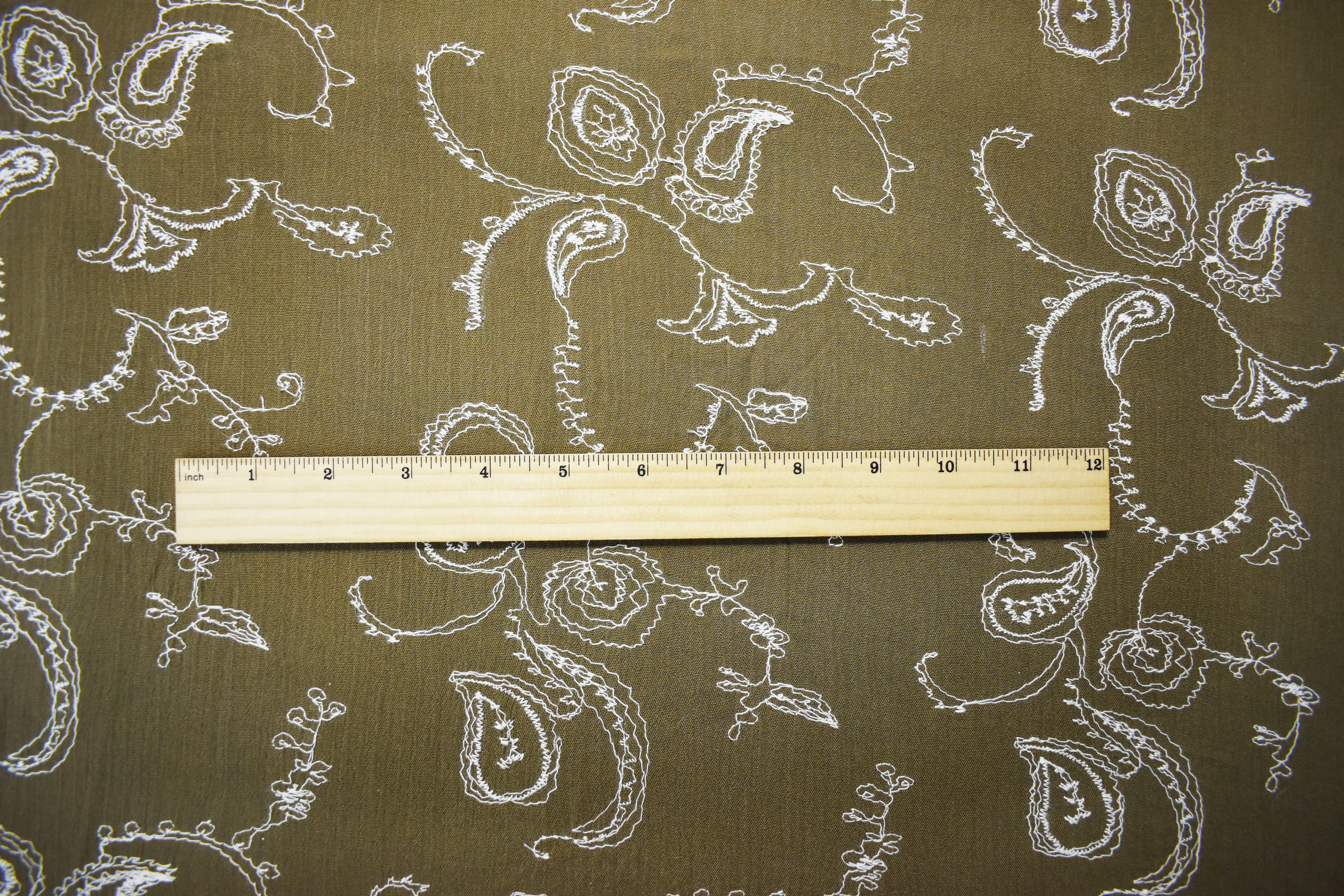 -100% cotton crinkled gauze woven fabric embroidered with a paisley vine-like pattern with florals.