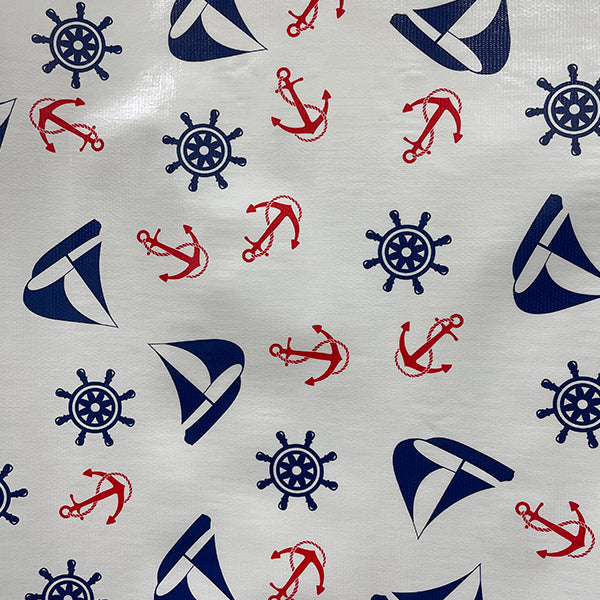 Red and Navy Blue Nautical Print on White Oilcloth Fabric