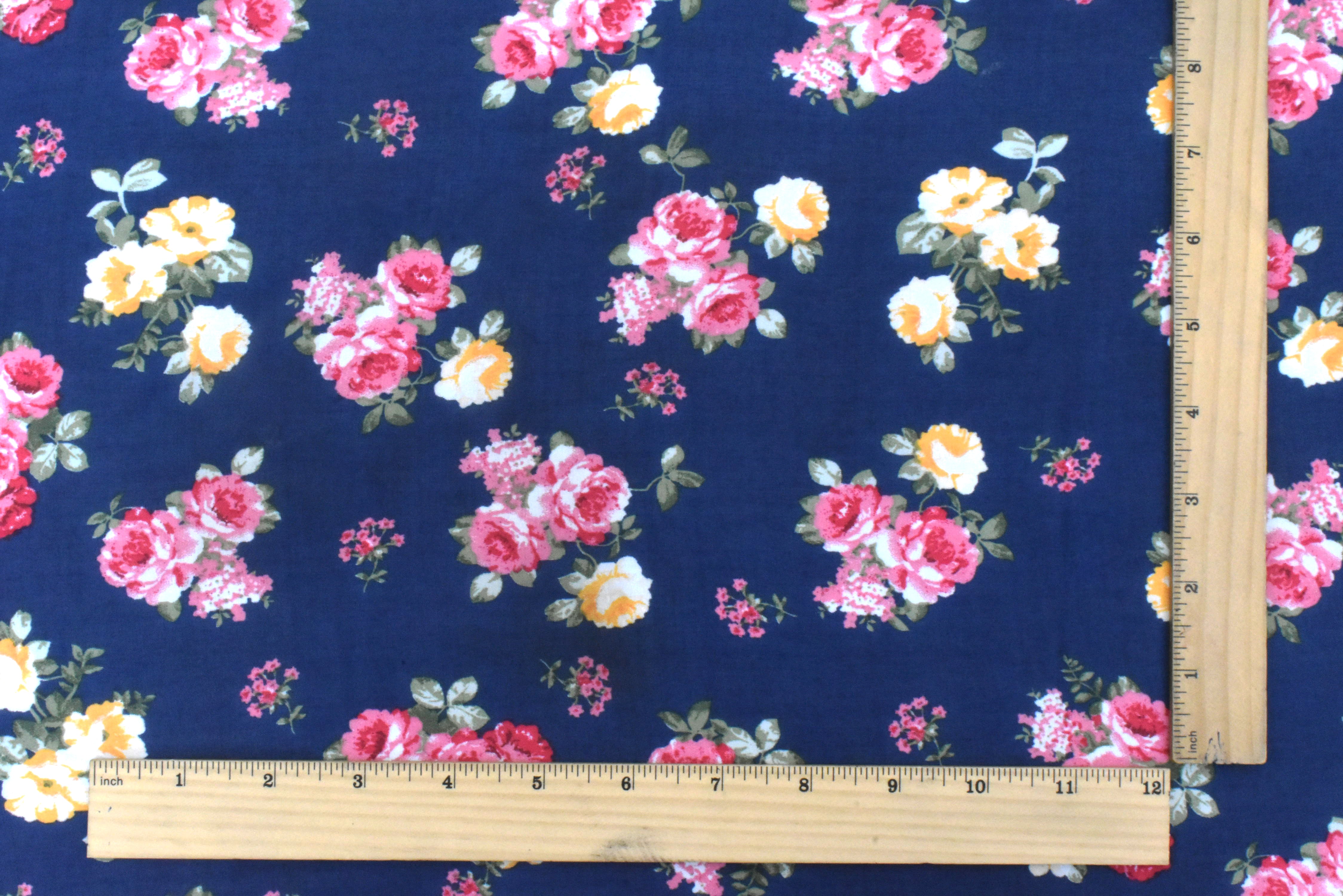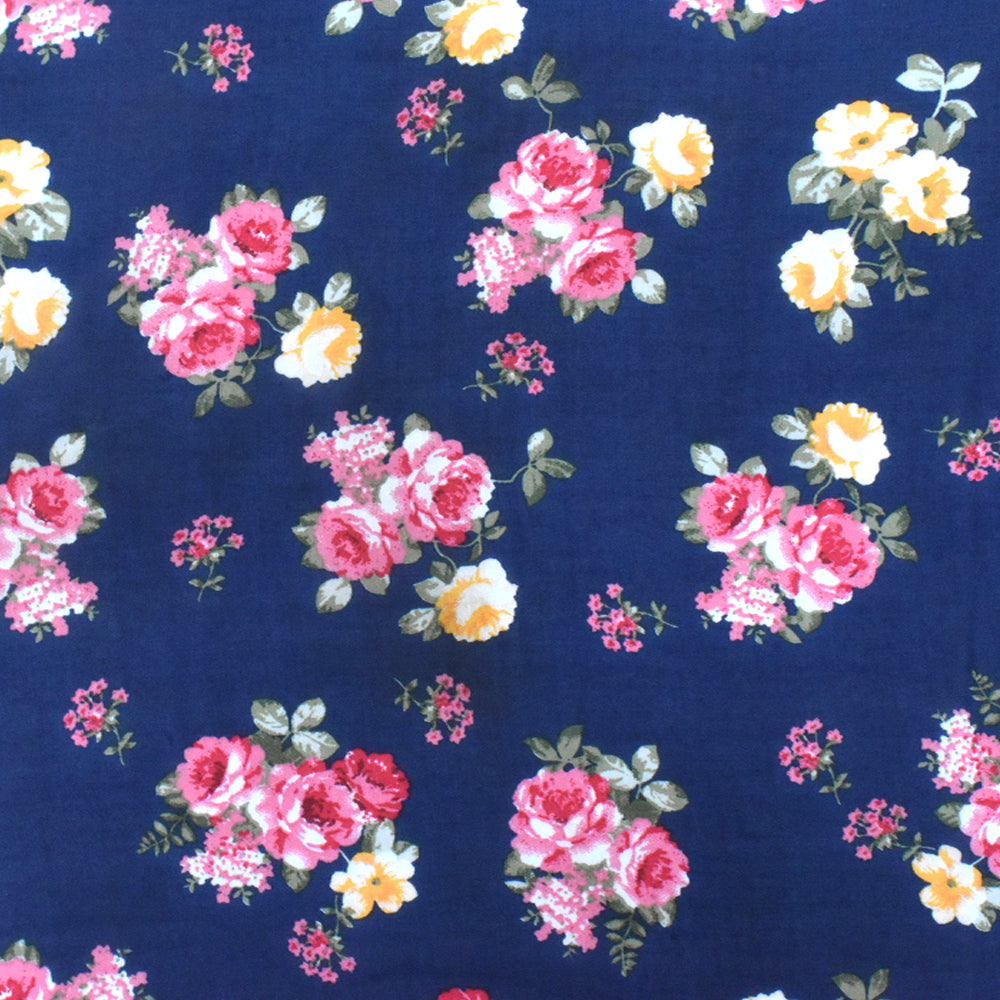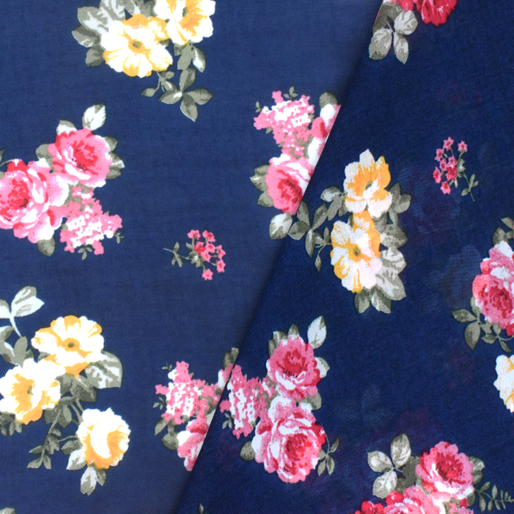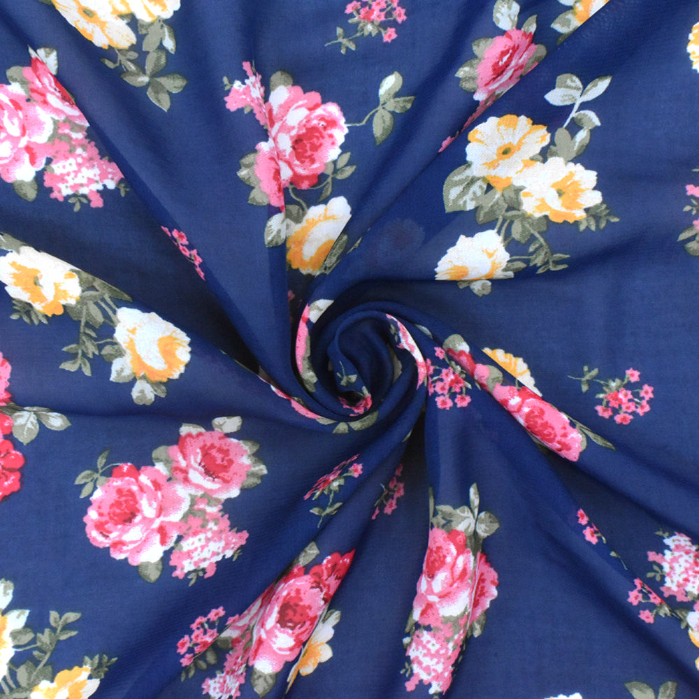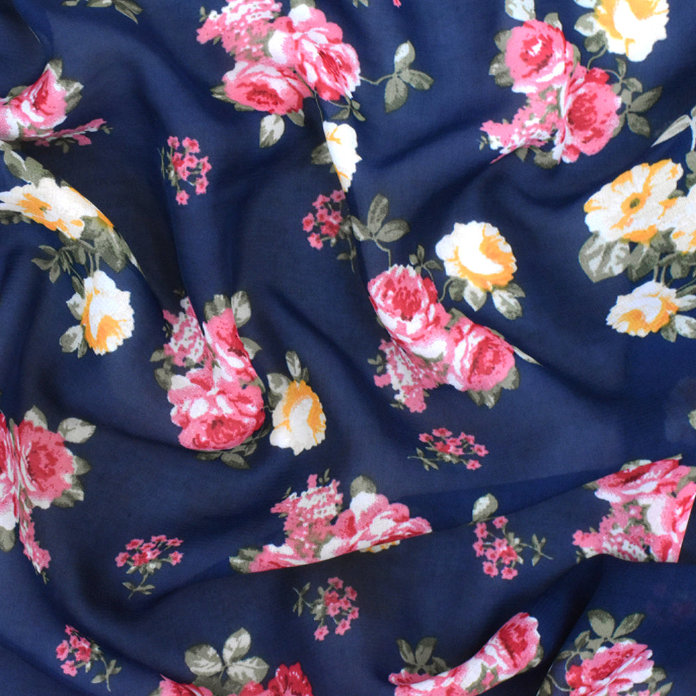 Navy Blue-Pink-Multi Floral Printed Polyester Chiffon Woven Fabric