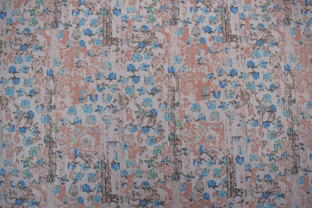 -Cotton stretch spandex twill sateen-like woven fabric printed with a floral pattern and a textured-like abstract surface. Made in Korea.