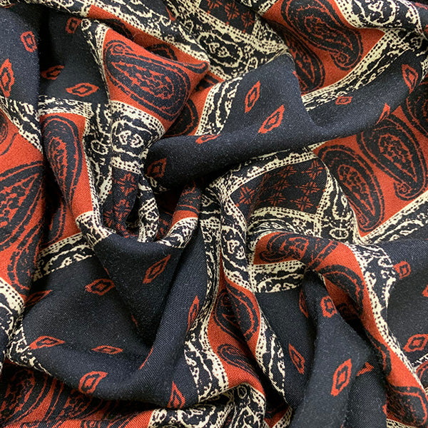 -Red, Black, Beige, & Brown Bandana Patchwork Print Rayon Challis Fabric