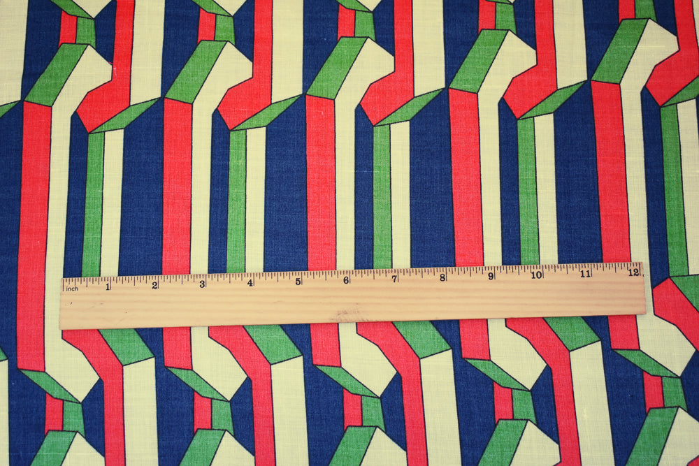 Red-Blue-Beige 3D Geometric Pattern Printed Linen Woven Fabric