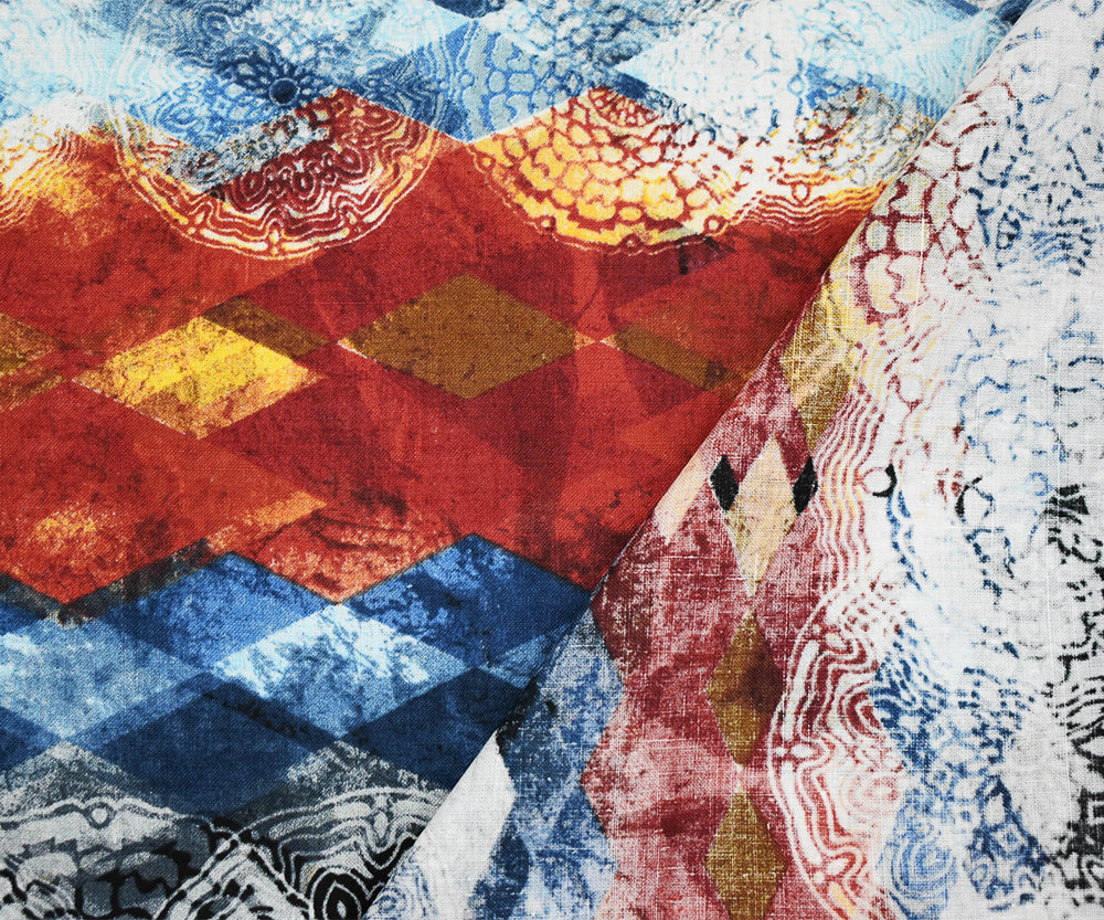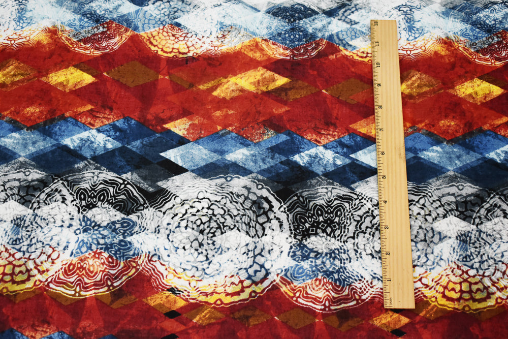 Red-Blue-Multi Diamond Medallion Pattern Printed Linen Woven Fabric