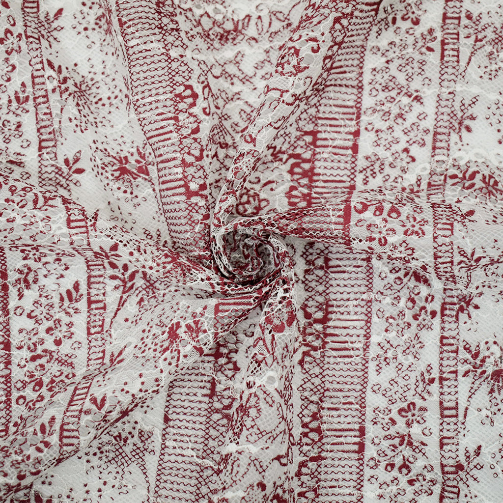 Red-White Nylon Floral Stripe Printed Lace Mesh Knit Fabric