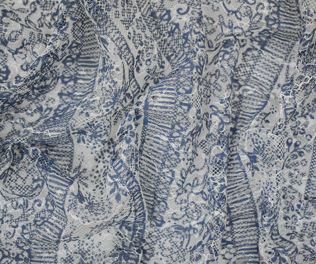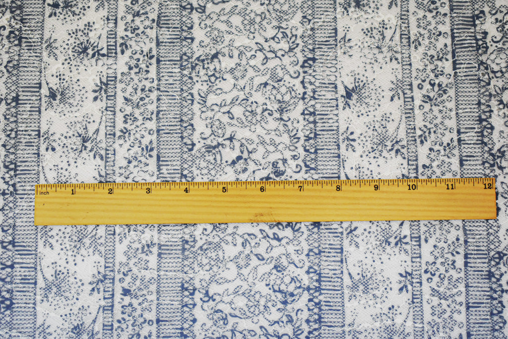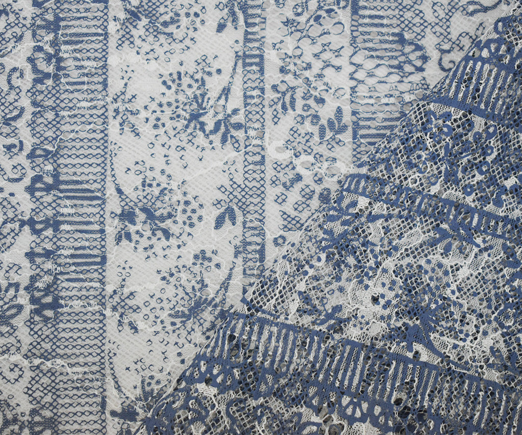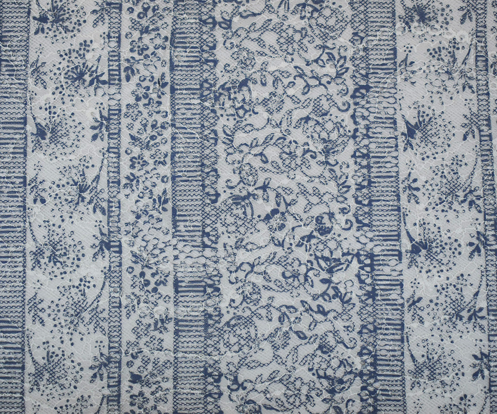 White-Blue Nylon Rayon Floral Stripe Printed Lace Mesh Knit Fabric