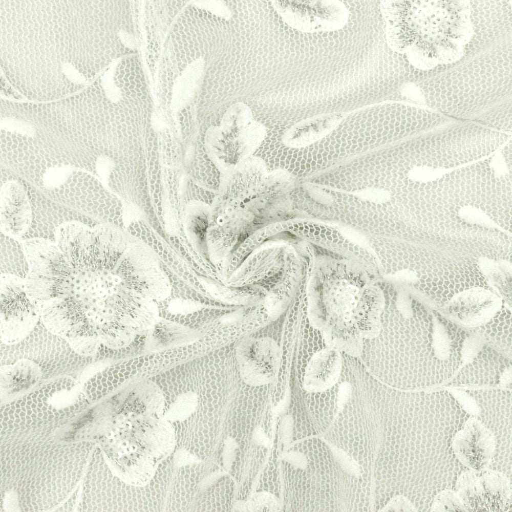 White-Silver Floral Metallic Sequin Embroidered Mesh Fabric
